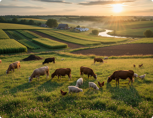 Promoting sustainable farming practices that restore soil fertility and ecological balance through livestock integration and natural nutrient cycles.By nurturing the soil and harmonizing crops with animals, we aim to build resilient,self-sustaining agricultural ecosystems for a healthier planet.